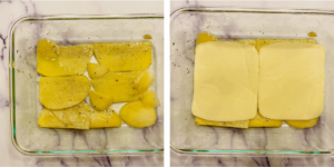 - Place potato slices at the bottom of the baking dish. Top it with sliced mozzarella sheet