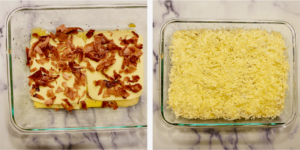 - Sprinkle ham pieces on top of the cheese. Repeat the process until you run out of potatoes. Sprinkle grated cheese on top