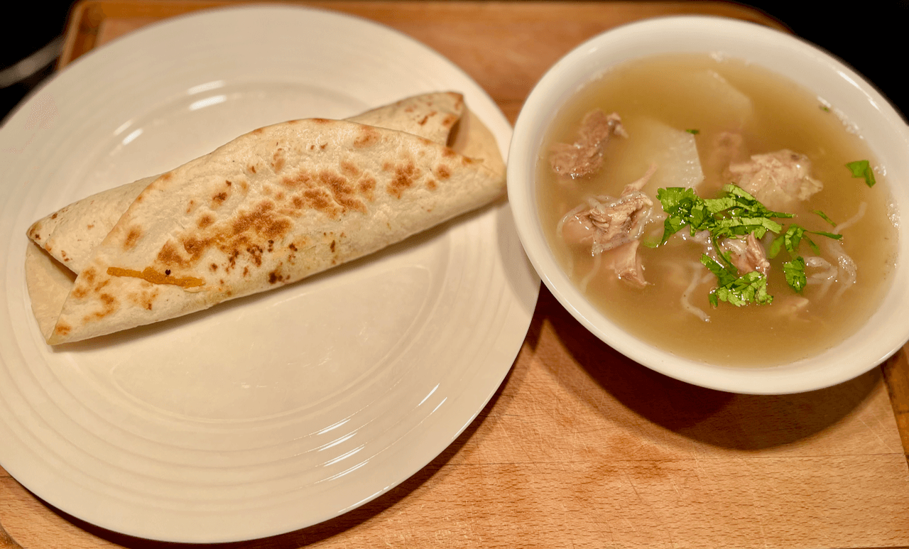 As I said before, burritos are popular and loved by my kids. Like other non-native dishes I cooked, I always add elements I am familiar with or borrow from other cultures. I frequently buy whole chicken to make stock, which is used in chicken noodle soup. I always save the chicken breast for other dishes. This way, the entire chicken is put into good use. It’s a simple, quick, and nutritious dish going well with a soup to your liking. In this post, I used a lamb soup with style from the Shanxi province in China. In the soup I added Japanese yam noodles.