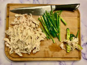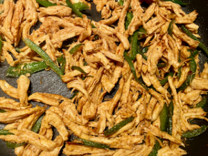 - Shred the pre-cooked chicken breast into small pieces, and chop the pepper